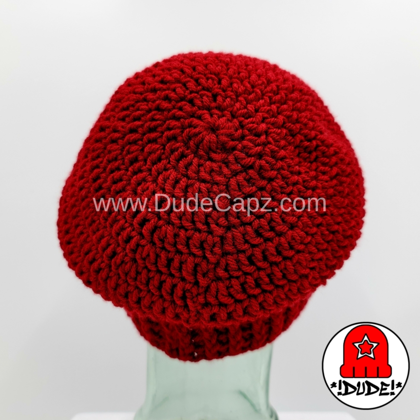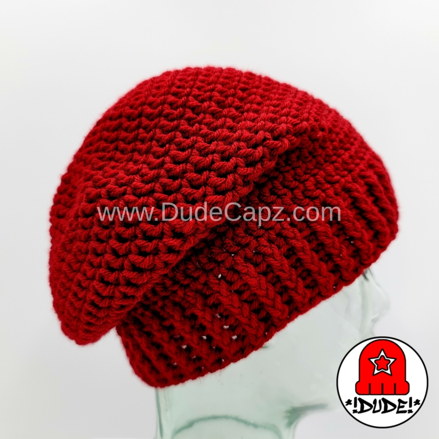 For men (or women, kids, & teenagers). Cranberry color crocheted slouchy beanie with ribbed brim. One size fits all. Handmade. This is the only beanie of this style available in this color. Made from 100% easy care soft acrylic yarn. Gentle handwashing and rinsing recommended, roll in a towel to remove excess water, and lay flat to dry. Buy now if you like this one. I have no plans to make another one in this color. SKU: C-SOL-001-CRANBERRY