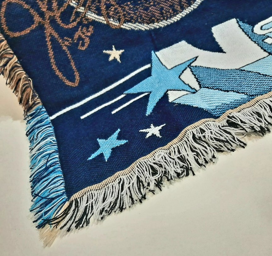 In this post I found this NSYNC woven tapestry style throw blanket with band member portraits. See photos below.