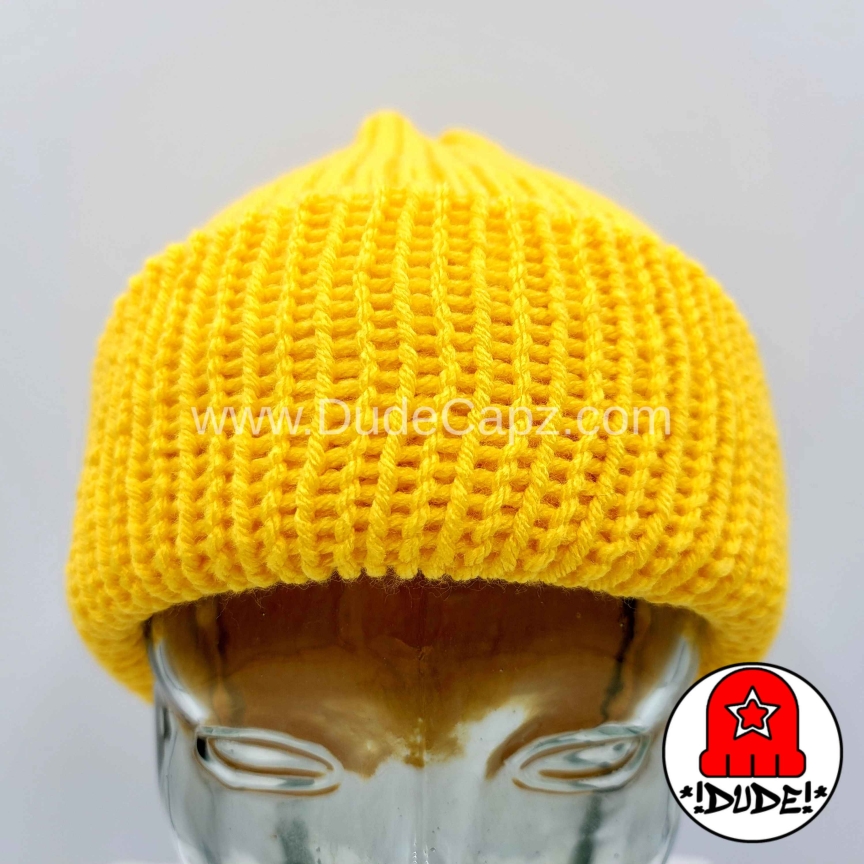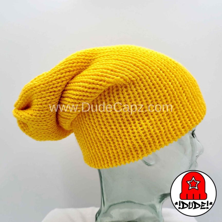 For men. Yellow, knit slouchy beanie. This is a machine knit beanie produced by me in my home studio. This is not a mass produced department store item, although it may resemble one. It can be worn slouchy, or roll up a brim for extra warmth around your ears. One size fits all, so it is perfect for women, kids & teenagers also. This is a handmade wearable by the beanie man – David Thrift (www.DudeCapz.com). Made from 100% easy care soft acrylic yarn. This item has a double thickness due to it’s construction. It is a warm hat. If you are looking for the warmest hats in my store, this is the style to get. Gentle handwashing and rinsing recommended, roll in a towel to remove excess water, and lay flat to dry.